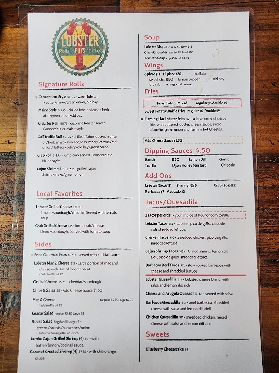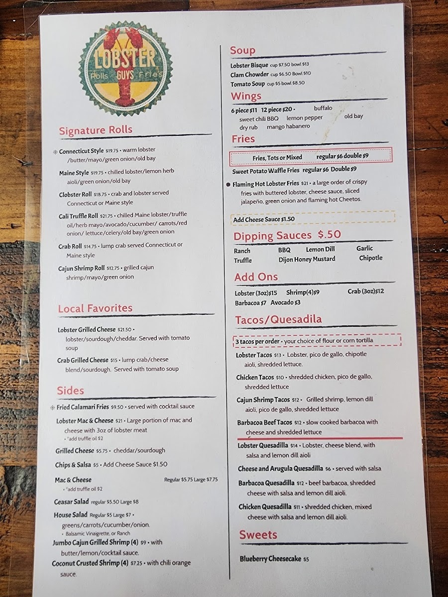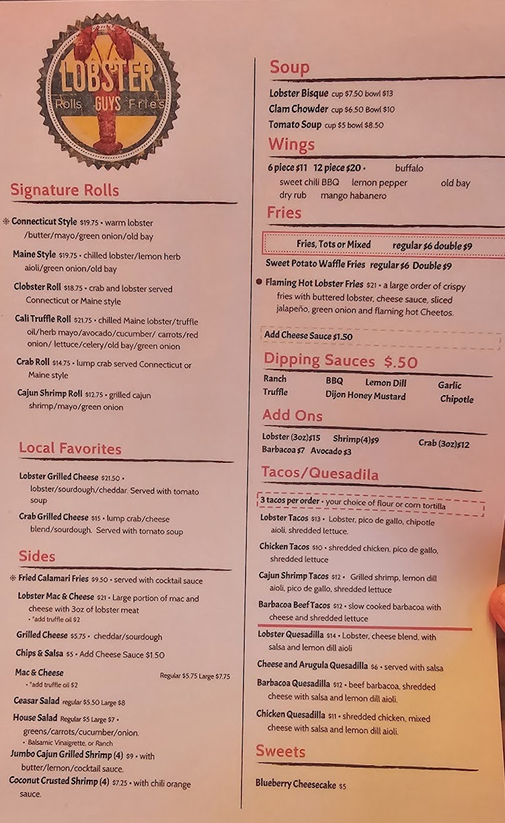 From a reviewer’s perspective, the menu at Lobster-Guys Los Angeles feels like a confident summary of what the brand does best: approachable seafood comfort food with bold flavors and plenty of variety. The taco and quesadilla section sets the tone with options like Shrimp Quesadilla, Beef Barbacoa Tacos, Shrimp Tacos, Cheese Arugula Quesadilla, and Chicken Tacos, offering both surf and turf choices that are easy to enjoy. For lighter or classic pairings, the salad selection-Romaine Salad Full, Caesar Salad Full, Romaine Salad Side, and Caesar Salad Side-adds balance to the menu. The heart of the experience lies in the combos, where choices such as Double Stuffed Roll, Mega Deal, Signature Combo Lobster Meal Combo, and Roll & Tail Combo showcase the restaurant’s lobster-forward identity in generous portions. Dishes meant for sharing, including Lobster Mac & Cheese, Lobster Nachos, Barbacoa Nachos, Chicken Nachos, and 6 Piece Wings, reinforce the casual, social dining vibe. The rolls and local favorites-Clobster Roll, Crab Roll, Cali Style Truffle Roll, Pasta Mare, and Pesto Shrimp Pasta-highlight creativity while staying rooted in comfort. Warm bowls like Lobster Bisque Bowl, Lobster Bisque Cup, Clam Chowder Bowl, Clam Chowder Cup, and Tomato Soup Bowl add depth, while sides such as Fries (Regular), Sweet Potato Fries (Regular), Tots Large, Mac & Cheese (Regular), and Sliced Avocado let diners customize their meal, especially with add-ons like 3oz Lobster, 3oz Crab, or Sliced Avocado. To finish on a sweet note, Blueberry Cheesecake provides a simple but satisfying dessert, and drinks like Coke, Mexican Sprite, Pellegrino Lemonade, Red Bull Sugar Free, and Na Drinks round out the experience. Overall, the menu feels cohesive and well-rounded, making Lobster-Guys Los Angeles a reliable choice for anyone craving indulgent lobster dishes mixed with familiar favorites.