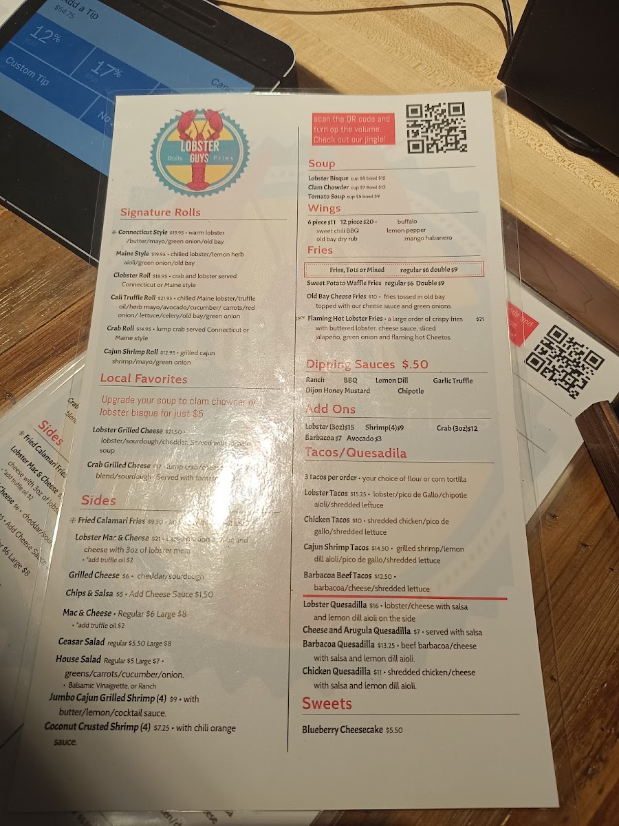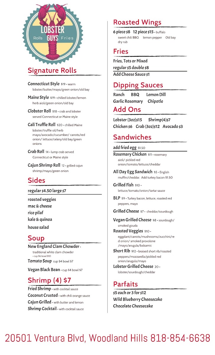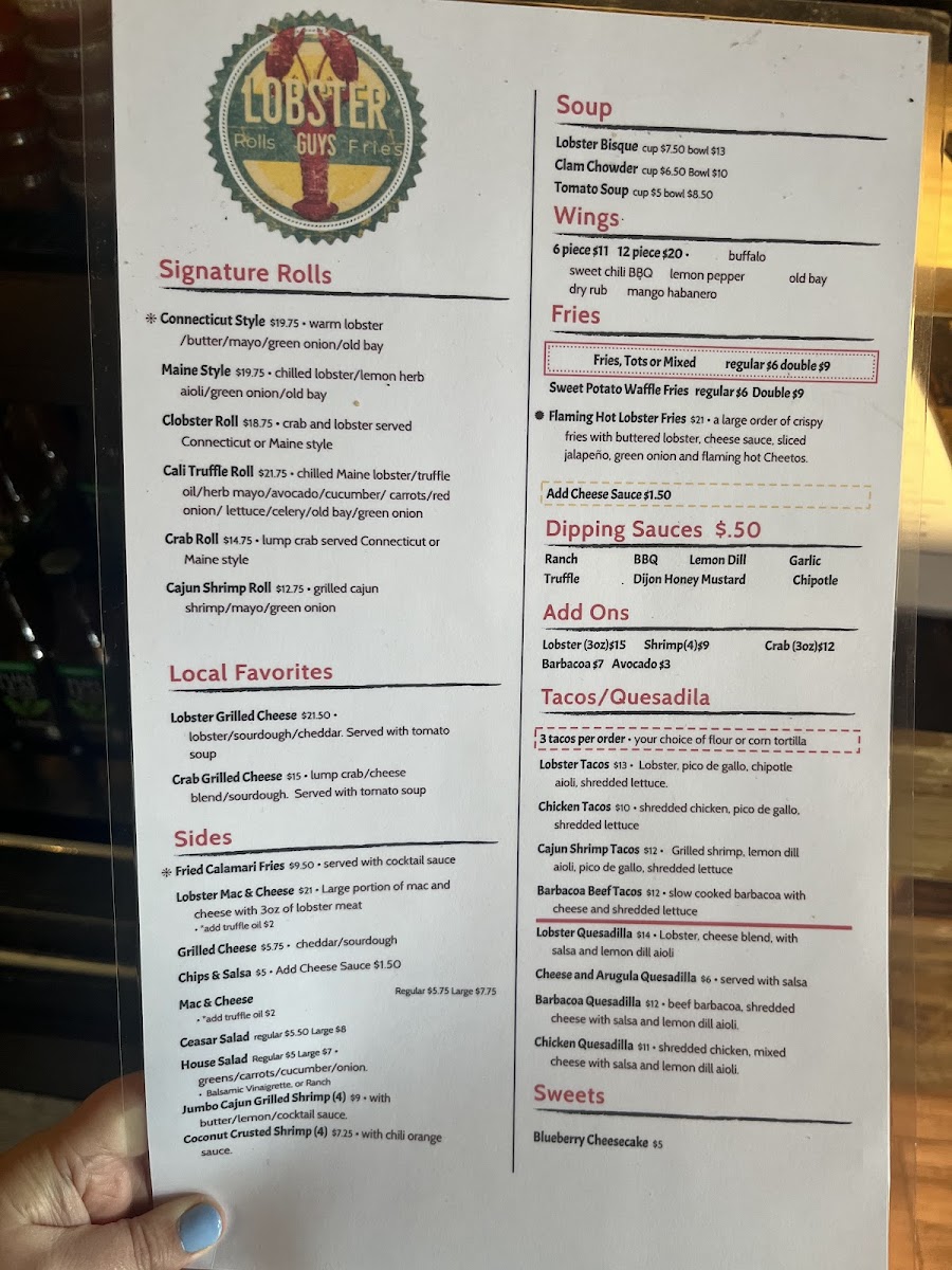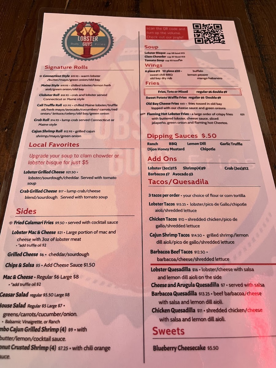 From a reviewer’s perspective, the menu at Lobster-Guys Los Angeles feels like a confident summary of what the brand does best: approachable seafood comfort food with bold flavors and plenty of variety. The taco and quesadilla section sets the tone with options like Shrimp Quesadilla, Beef Barbacoa Tacos, Shrimp Tacos, Cheese Arugula Quesadilla, and Chicken Tacos, offering both surf and turf choices that are easy to enjoy. For lighter or classic pairings, the salad selection-Romaine Salad Full, Caesar Salad Full, Romaine Salad Side, and Caesar Salad Side-adds balance to the menu. The heart of the experience lies in the combos, where choices such as Double Stuffed Roll, Mega Deal, Signature Combo Lobster Meal Combo, and Roll & Tail Combo showcase the restaurant’s lobster-forward identity in generous portions. Dishes meant for sharing, including Lobster Mac & Cheese, Lobster Nachos, Barbacoa Nachos, Chicken Nachos, and 6 Piece Wings, reinforce the casual, social dining vibe. The rolls and local favorites-Clobster Roll, Crab Roll, Cali Style Truffle Roll, Pasta Mare, and Pesto Shrimp Pasta-highlight creativity while staying rooted in comfort. Warm bowls like Lobster Bisque Bowl, Lobster Bisque Cup, Clam Chowder Bowl, Clam Chowder Cup, and Tomato Soup Bowl add depth, while sides such as Fries (Regular), Sweet Potato Fries (Regular), Tots Large, Mac & Cheese (Regular), and Sliced Avocado let diners customize their meal, especially with add-ons like 3oz Lobster, 3oz Crab, or Sliced Avocado. To finish on a sweet note, Blueberry Cheesecake provides a simple but satisfying dessert, and drinks like Coke, Mexican Sprite, Pellegrino Lemonade, Red Bull Sugar Free, and Na Drinks round out the experience. Overall, the menu feels cohesive and well-rounded, making Lobster-Guys Los Angeles a reliable choice for anyone craving indulgent lobster dishes mixed with familiar favorites.